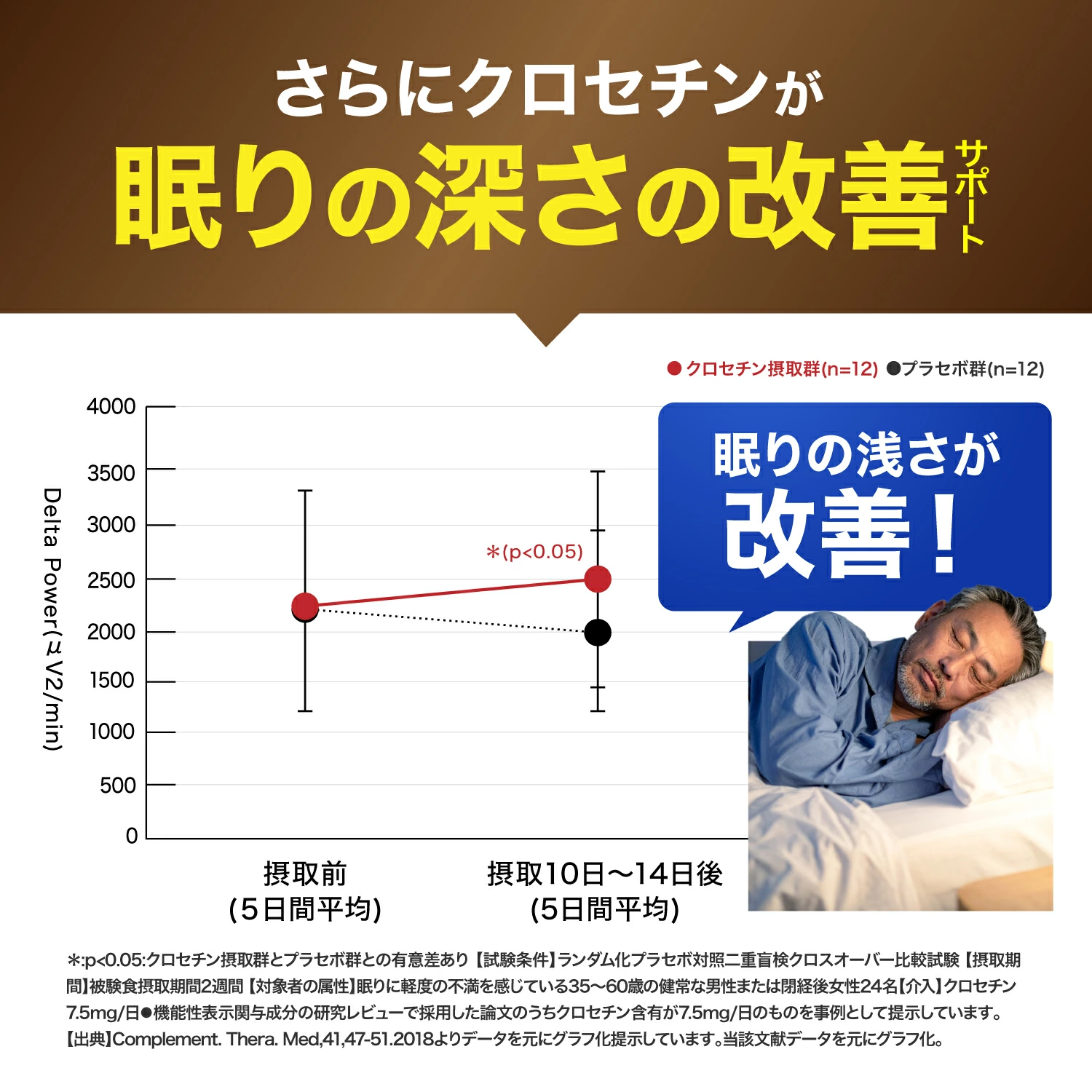 クロセチンは、睡眠中のコンディションに関わる成分として知られており、眠りが浅い・途中で目が覚めやすいといった悩みに対し、眠りの深さの改善をサポートする成分です。
